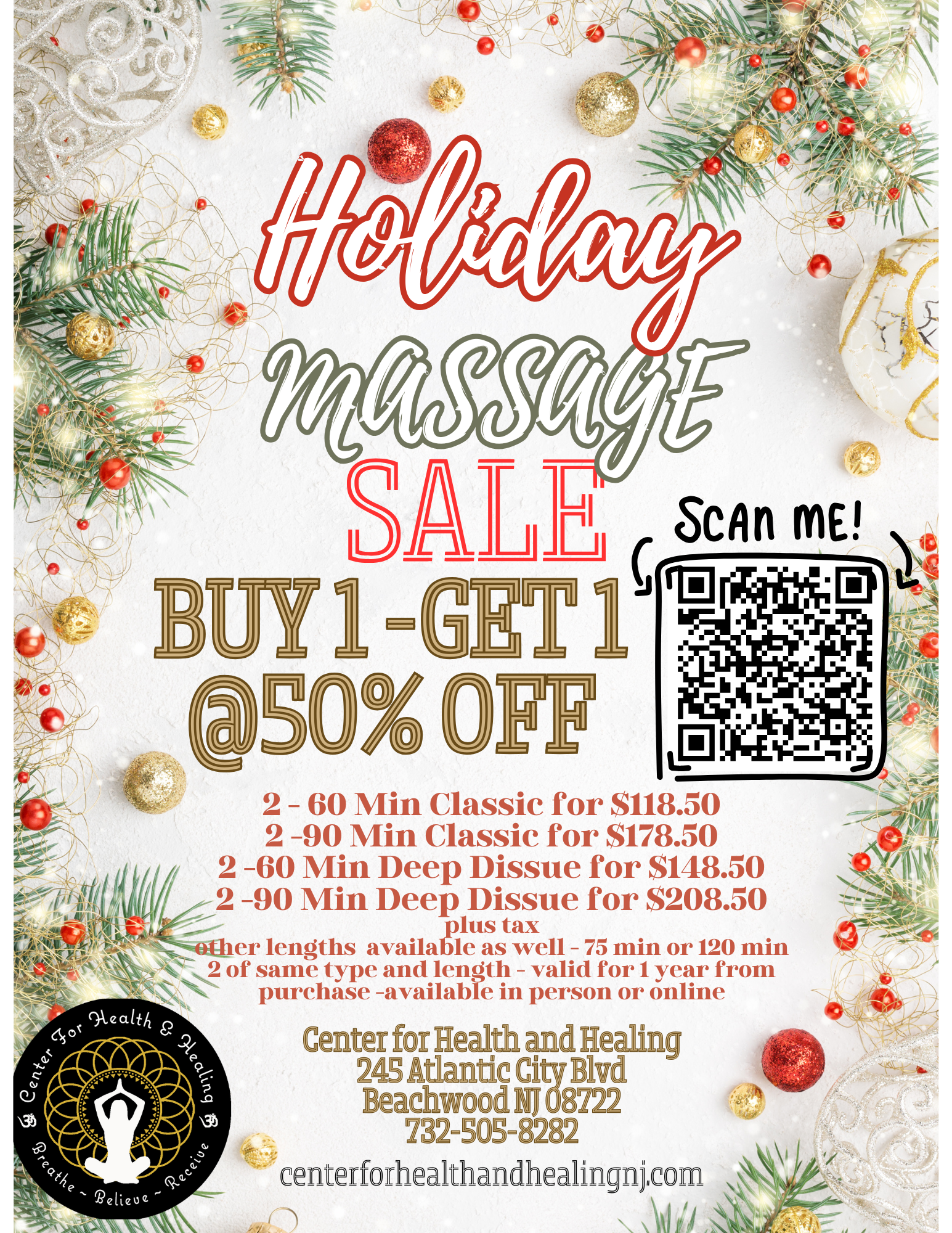 The holidays hit hard—your stress doesn’t have to. Treat yourself (or someone you love) to deep relaxation with our Holiday Massage Sale. Buy one massage and get the second at 50% off, perfect for stocking up on self-care or gifting pure bliss. Classic or Deep Tissue, 60 or 90 minutes—the choice is all comfort.